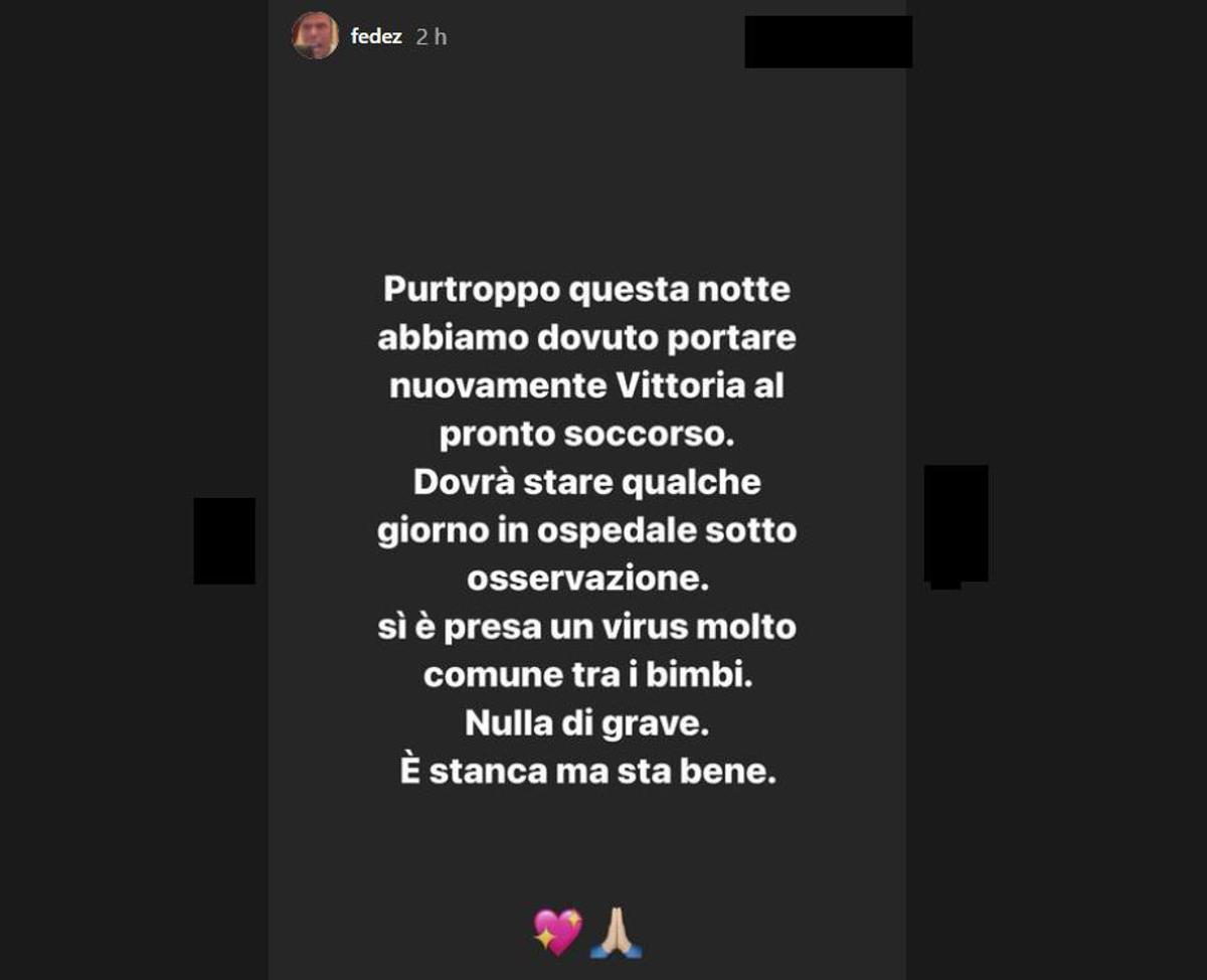 Vittoria, la figlia di Chiara Ferragni e Fedez, è ricoverata in ospedale dove rimarrà qualche giorno in osservazione. Su Instagram il rapper scrive che “purtroppo questa notte abbiamo dovuto portare nuovamente Vittoria al pronto soccorso. Dovrà stare qualche giorno in ospedale sotto osservazione. Si è presa un virus molto comune tra i bimbi. Nulla di grave, è stanca ma sta bene”.