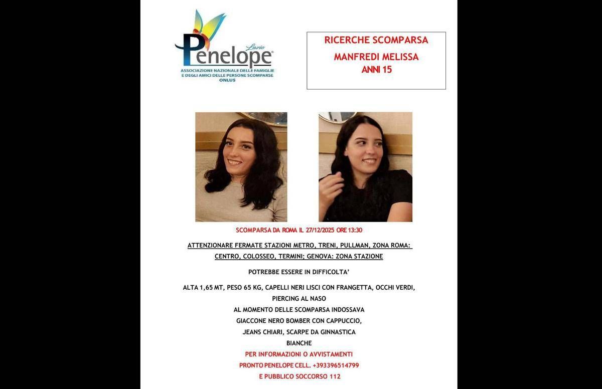 (Adnkronos) – Da giorni non si hanno più notizie di una giovane di 15 anni, residente ad Ostia. Lei, Melissa Manfredi, si è allontanata da casa intorno alle 13,30 del 27 dicembre senza farvi più ritorno. Sarebbe scomparsa insieme al presunto fidanzato, un ventenne di origine tunisina. L’ultimo contatto con la famiglia è avvenuto alle 16 di sabato, quando più o meno a quell’ora è stata vista nei pressi della stazione metro Colosseo. Poi di colpo più niente: il telefono di lei e del ventenne muti. L’ultimo segnale del cellulare di Melissa sarebbe stato rilevato a Genova.