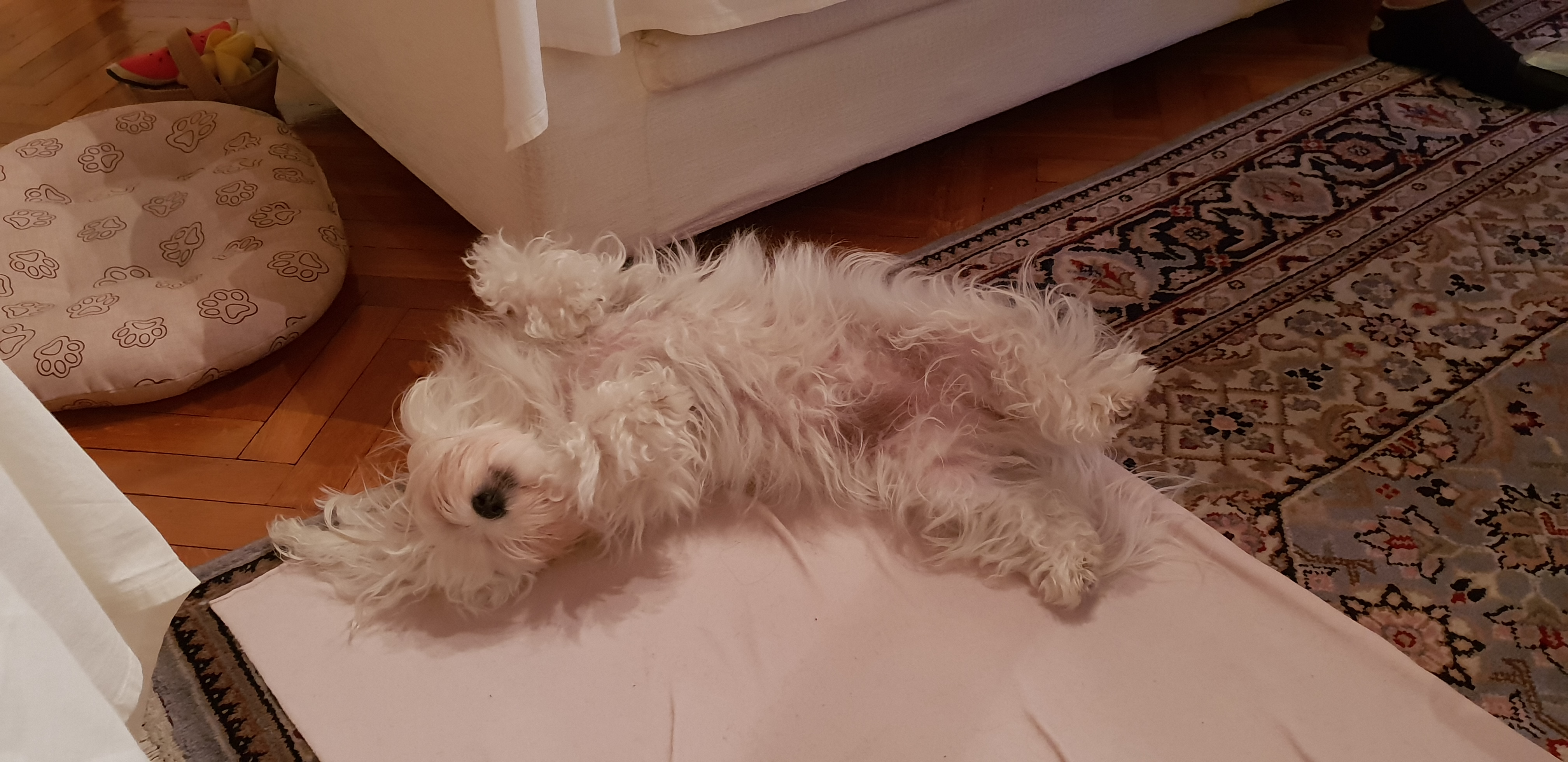 E’ una posizione molto comoda ed è adatta al sonno profondo. E’ anche la posizione più vulnerabile perchè lascia tutto esposto. E’ considerata quindi la posizione dei cani contenti, tranquilli e sicuri di sè.